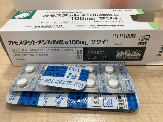 カモスタットメシル酸塩錠100mg「サワイ」YJ:3999003F1319 販売元: 沢井製薬 製造(輸入)元: メディサ新薬 包装単位: 10.000錠